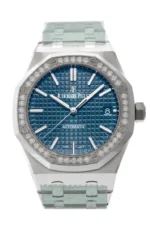 Silver-tone stainless steel case with a silver-tone stainless steel bracelet. 8 screws fixed silver-tone diamond set bezel. Blue with grande tapisserie pattern dial with silver-tone hands and index hour markers. Minute markers around the outer rim. Dial Type: Analog. Luminescent hands and markers. Date display at the 3 o’clock position. Audemars Piguet Calibre 3120 Automatic movement, containing 40 Jewels, composed of 280 parts, bitting at 21600 vph, and has a power reserve of approximately 60 hours. Scratch resistant sapphire crystal. Screw down crown. Transparent case back. Octagon case shape, case size: 37 mm, case thickness: 9.8 mm. Ap folding clasp. Water resistant at 50 meters / 165 feet. Functions: date, hour, minute, second. Luxury watch style. Watch label: Swiss Made.