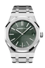 Audemars Piguet Royal Oak 41mm Khaki Green Dial 50th Anniversary Watch 15510ST.OO.1320ST.04. 41 mm Royal Oak Selfwinding in stainless steel sports the collection’s ergonomic design evolution as well as a Grande Tapisserie dial in a new khaki shade. Case 41mm Thickness 10.5 mm Water Resistance 50 m “Khaki Green” dial with “Grande Tapisserie” pattern, white gold applied hour-markers and Royal Oak hands with luminescent coating. Stainless steel bracelet with AP folding clasp Bracelet. Calibre 4302 Functions Hours, Minutes, Centre Seconds And Date. Number Of Jewels 32 Mechanism Selfwinding Power Reserve 70 H Total Diameter 32 mm Number Of Parts 257 Frequency 4 Hz 28,800 Vph Thickness 4.8 mm