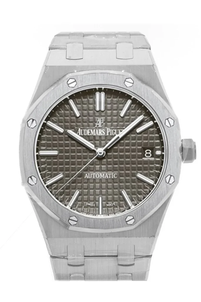 Audemars Piguet Royal Oak Grey Dial 15551ST.ZZ.1356ST.03 “50th Anniversary” tone-on-tone 37 mm model marries stainless steel with a diamond-set bezel, a grey “Grande Tapisserie” dial and a matching “50-years” oscillating weight visible through the caseback. It encompasses the new Royal Oak design evolution as well as the new selfwinding Calibre 5900. Stainless steel case, bezel set with brilliant-cut diamonds, glareproofed sapphire crystal and caseback. 37 mm Size 9 mm Thickness 50 m Water Resistance. Grey dial with “Grande Tapisserie” pattern, white gold applied hour-markers and Royal Oak hands with luminescent coating. Stainless steel bracelet with AP folding clasp. 40 brilliant-cut diamonds; ~0.92 carat (bezel).