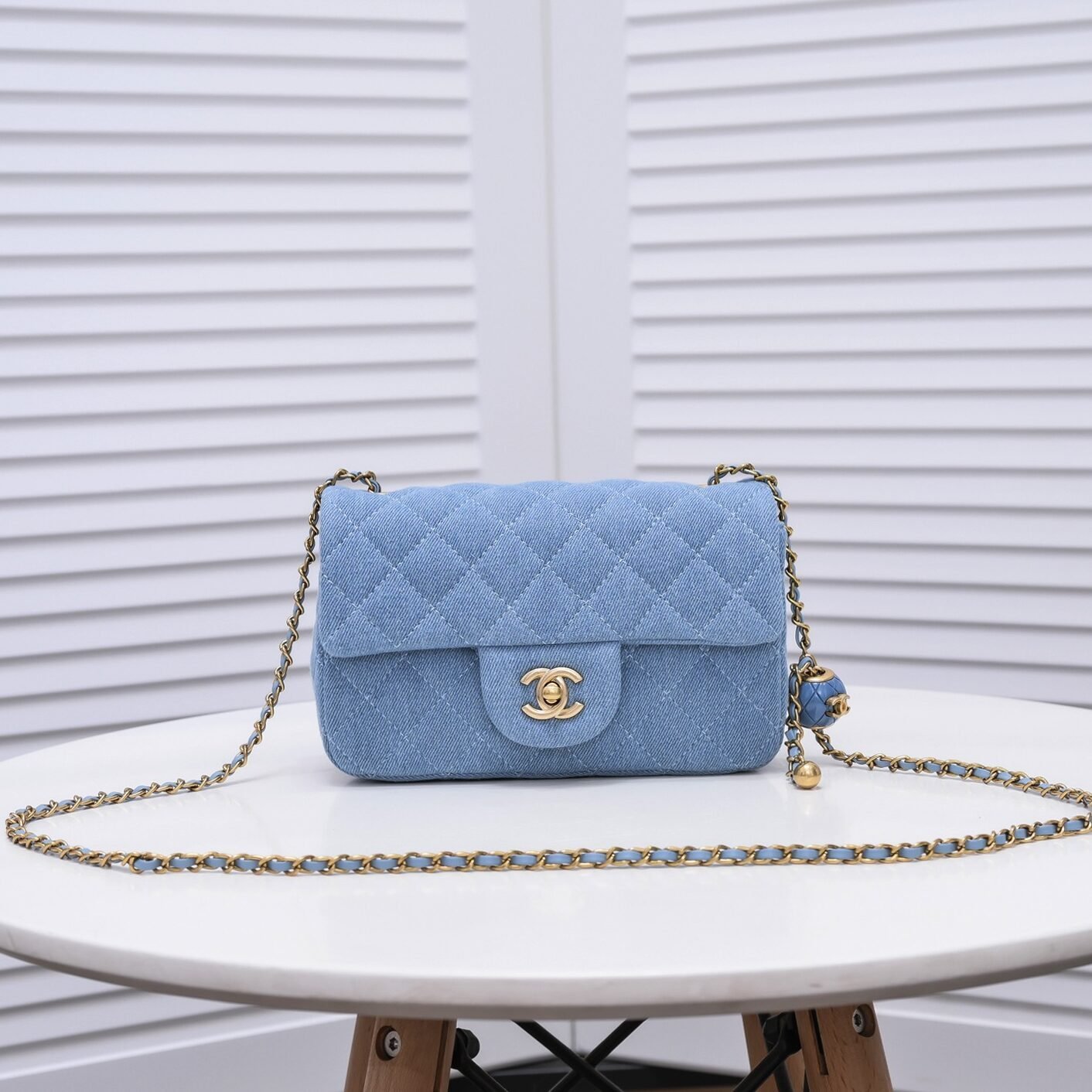 Large Chanel latest counter CF style with gold pearl, can add a gold pearl to adjust the shoulder strap length, making it more refined. Made of denim, with matching hardware, quality is superior. Can be worn crossbody or on one shoulder, or the strap can be shortened to use as an underarm bag. Model number: 1787, denim. Large size: 20×13×7 cm.