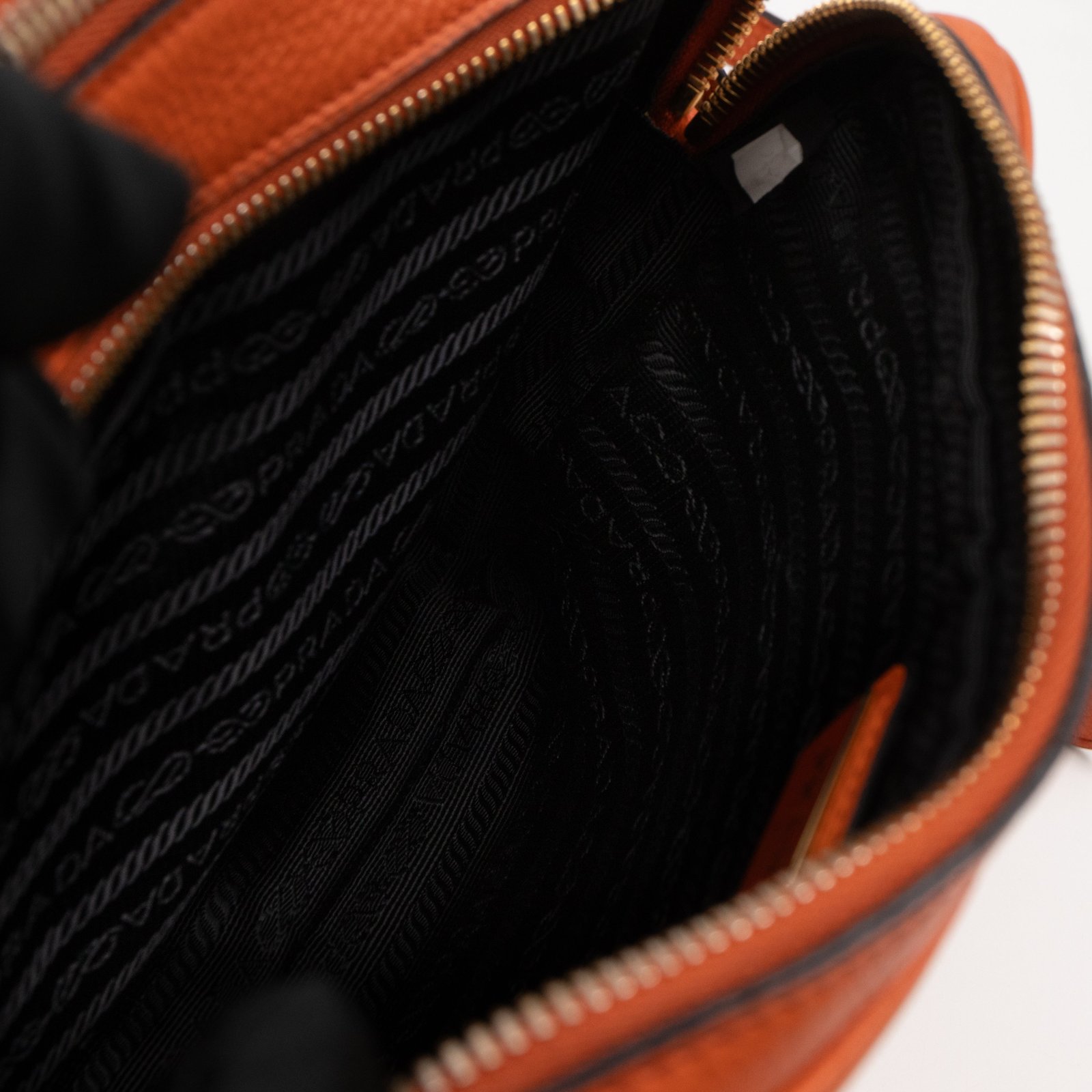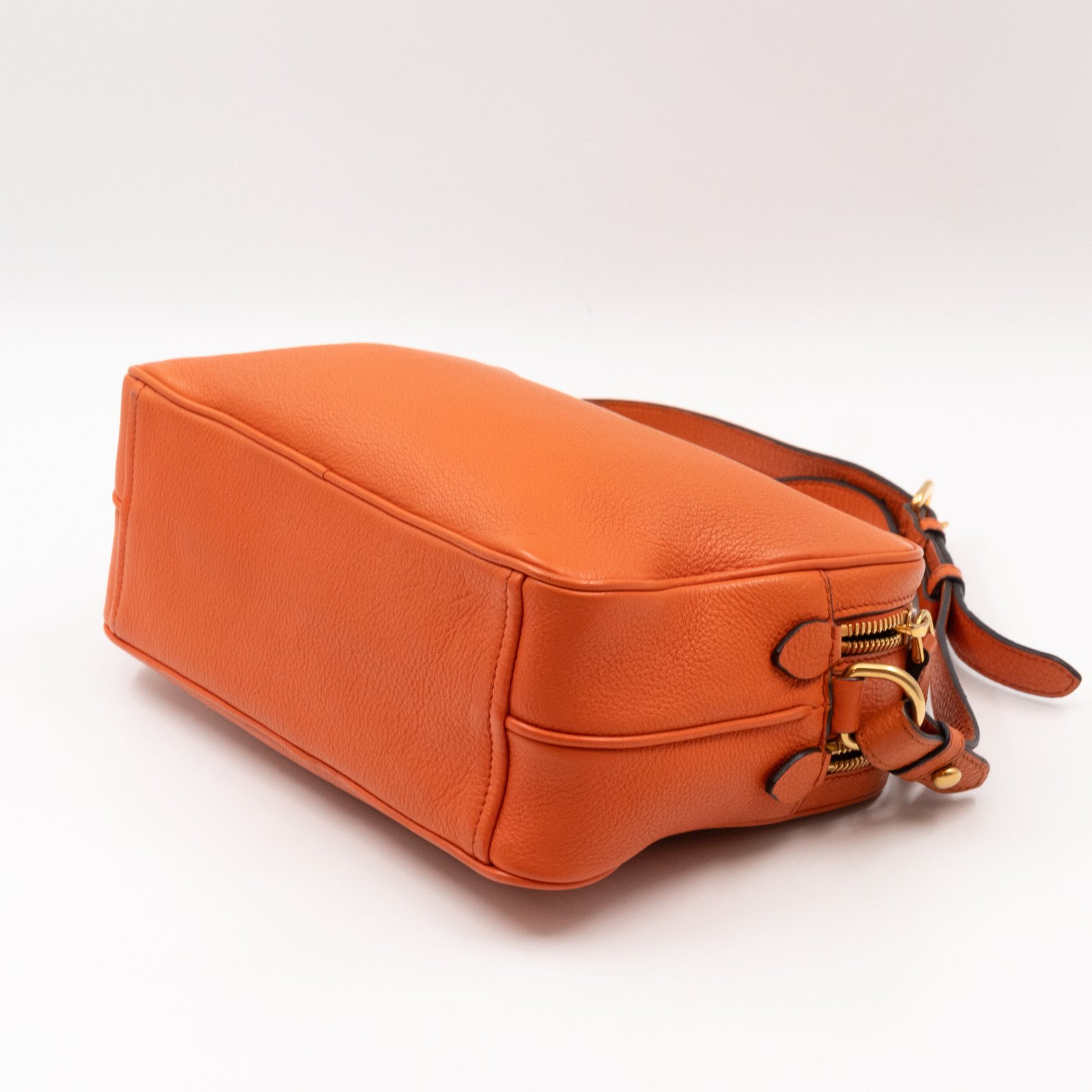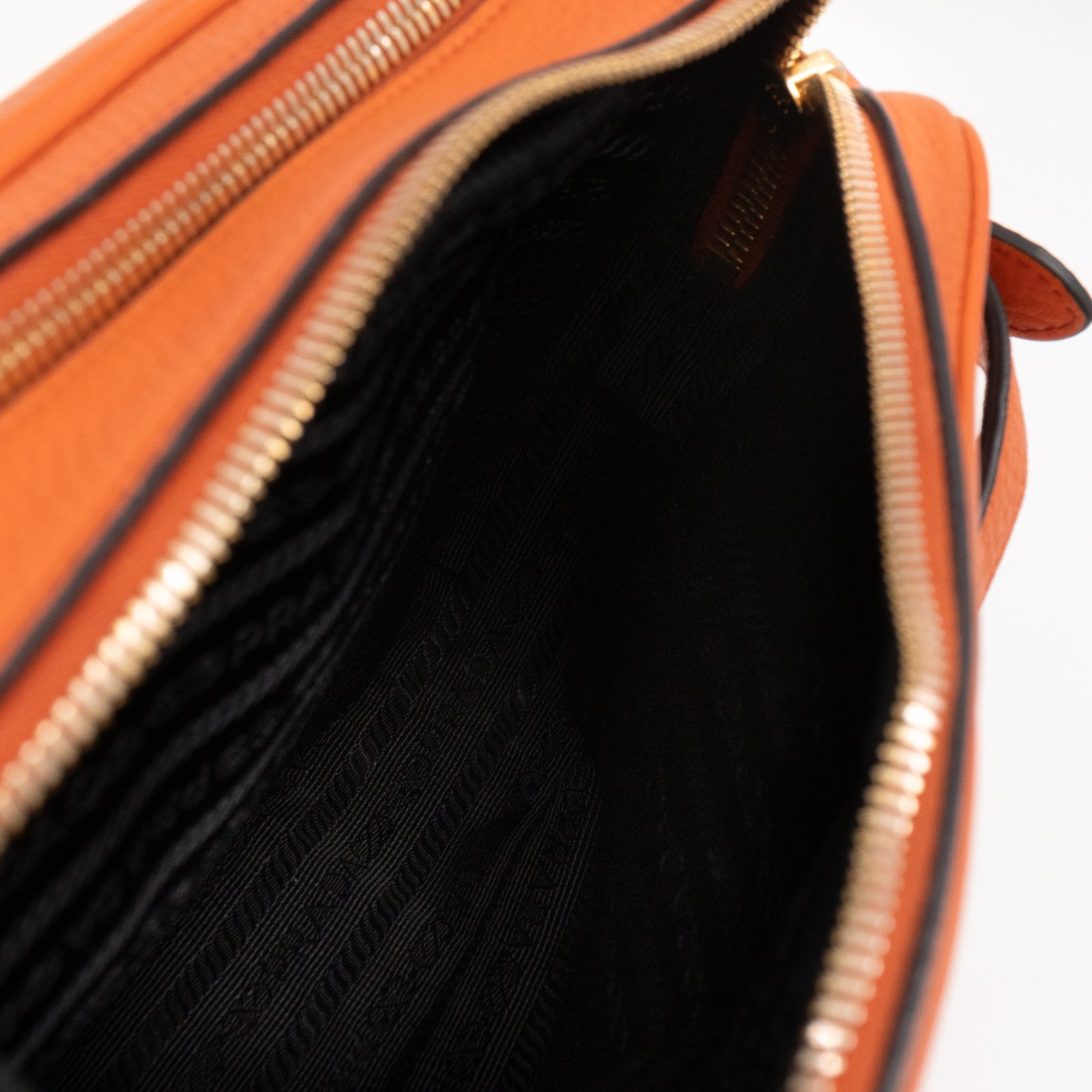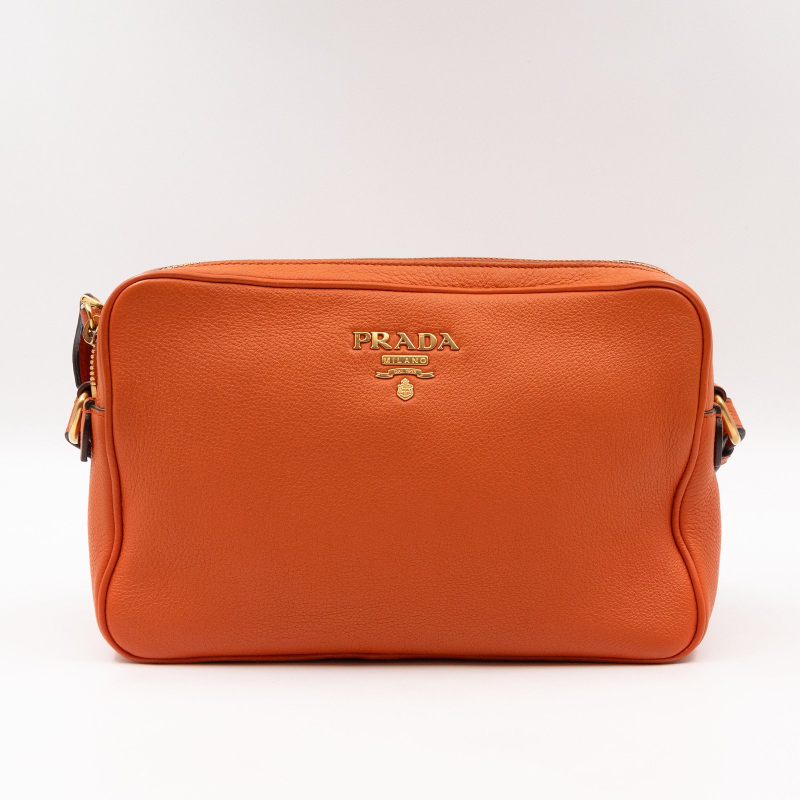 This is a Prada Double Zip Camera Bag. Made in orange phenix vitello leather. This bag has a shoulder strap for comfortable crossbody use. On front a Prada logo in gold-tone. It has double zip and each zipper opens to reveal a spacious compartment. Great for daily use for your phone, cards, and keys.Â