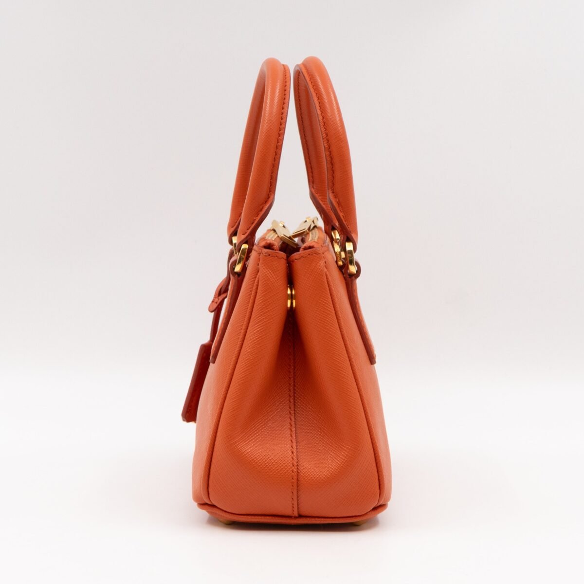 A cute micro sized edition Prada Galleria Micro Double Zip bag. Made with Saffiano leather in orange, combined with gold-tone hardware. This miniature Galleria fits your phone, and wallet, with other small items. Each side has zipper pockets, the middle compartment expands to a more spacious size. Current retail price over €3200.