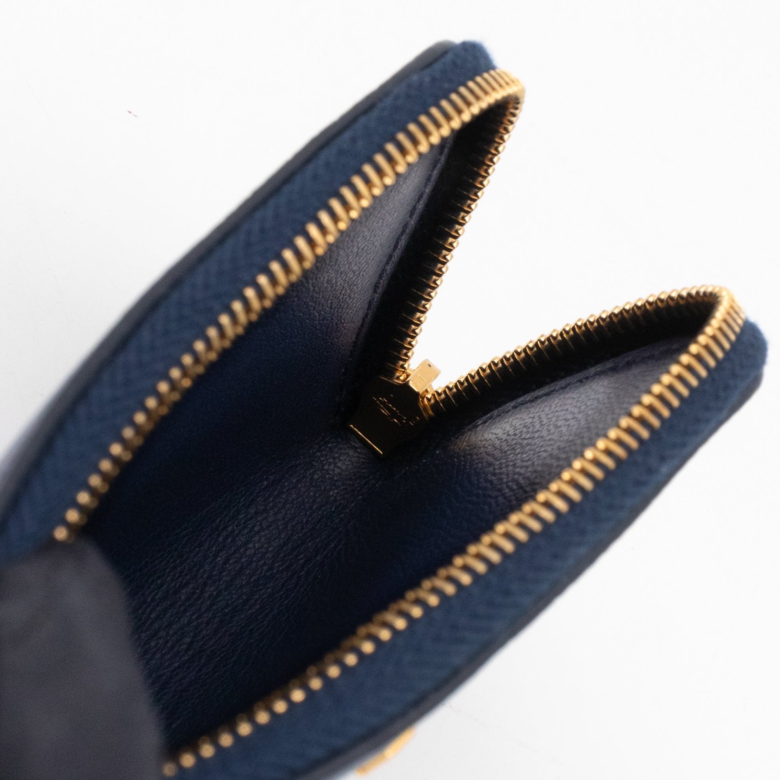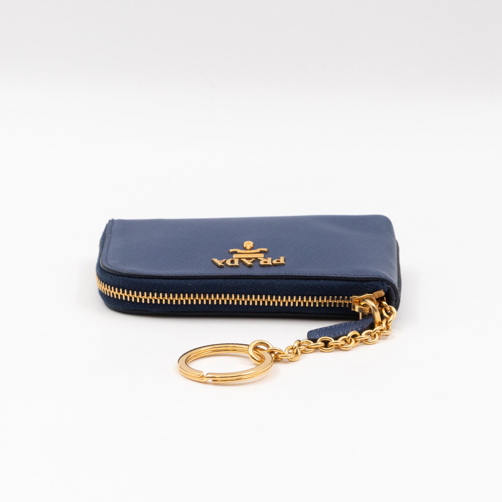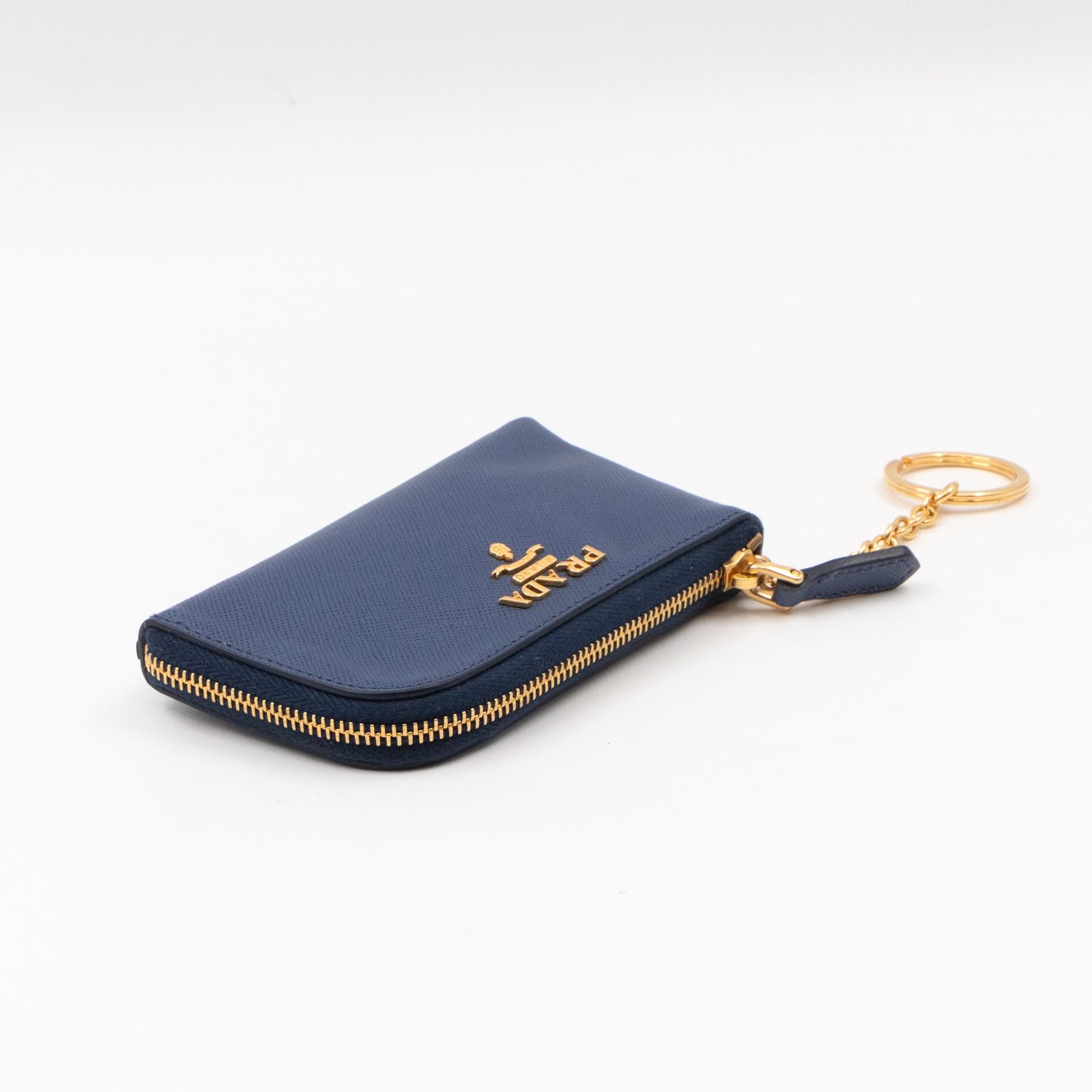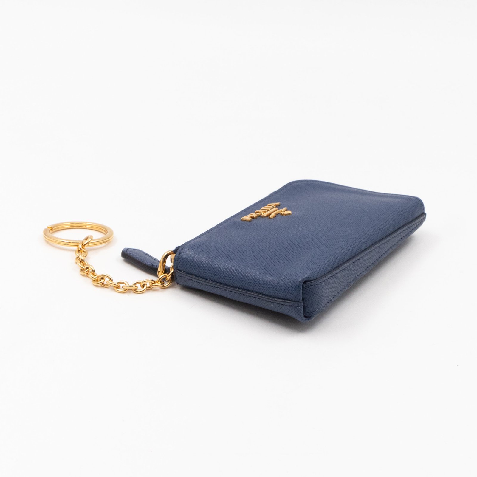 A practical mini Key Pouch from Prada. This everyday accessory is made with blue saffiano leather, it has zipper closure and a key ring on chain inside. Attach it your bag or keep it in your pocket. It fits keys, coins and even bank cards.Â