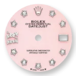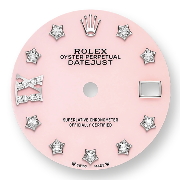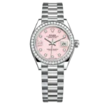 The light reflections on the case sides and lugs highlight the elegant profile of the 28 mm Oyster case, which is fitted with a diamond-set bezel. Rolex’s classic feminine watch, the Lady-Datejust is in the lineage of the Datejust, the emblematic model that has been a byword for style and accurate timekeeping.