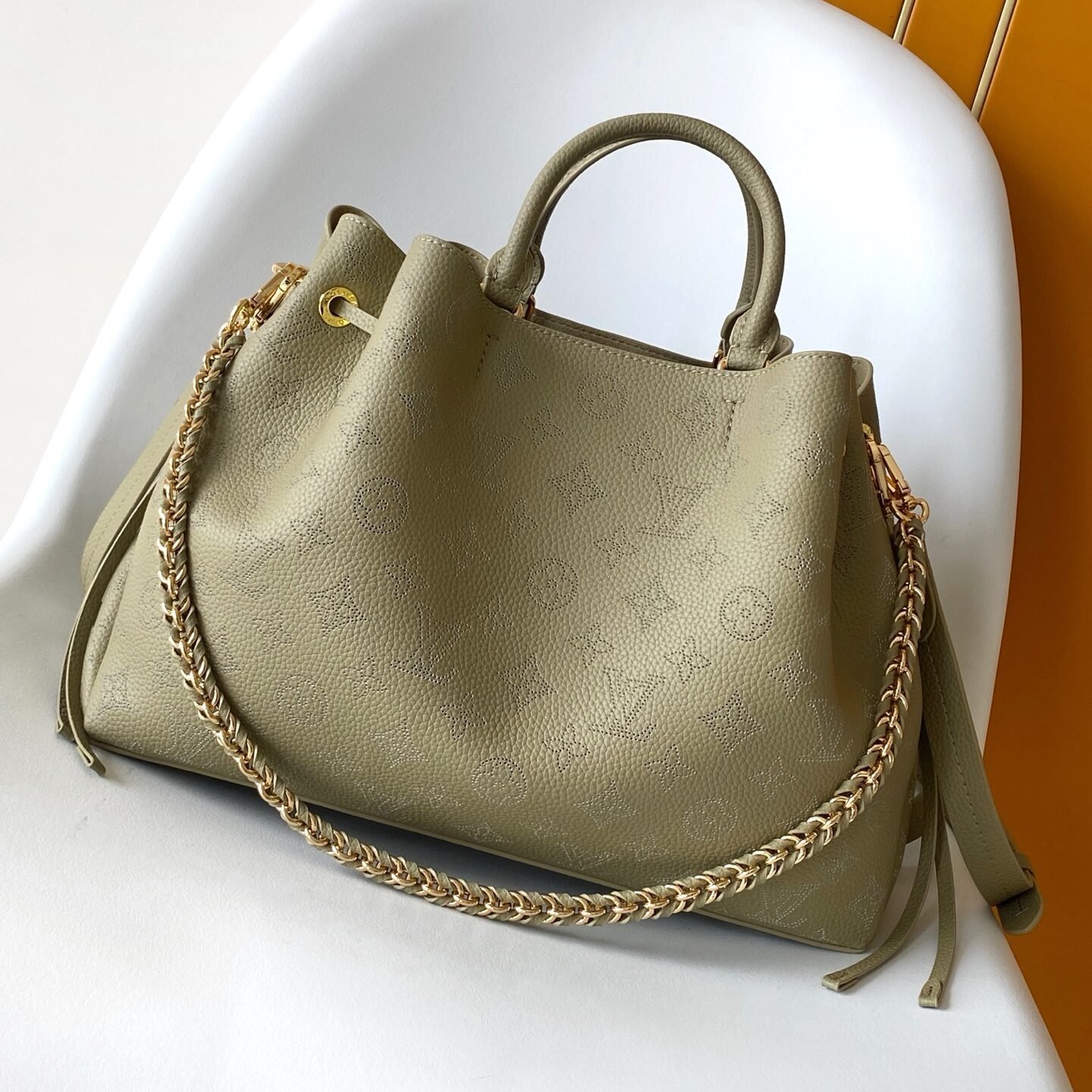 Dynamic 163 M25876 Gray-Green Top-Level Original Bella Tote Handbag made of soft perforated floral leather, featuring gentle pleats and drape effects, accented with jewelry-like chains. The spacious structure has a neatly organized interior to meet daily travel needs, adding a modern touch to casual outfits. 32.0 x 23.0 x 13.0 cm (Length x Height x Width) • Perforated floral leather • Leather trim • Microfiber lining • Metal fittings • Leather drawstring to prevent items from falling • Interior divider • Zippered inner pocket • Metal base studs • Strap: detachable, adjustable • Strap half-length: 30.0 cm • Adjustable strap half-length: up to 39.0 cm • Chain: detachable • Chain half-length: 23.0 cm • Handles: double handles