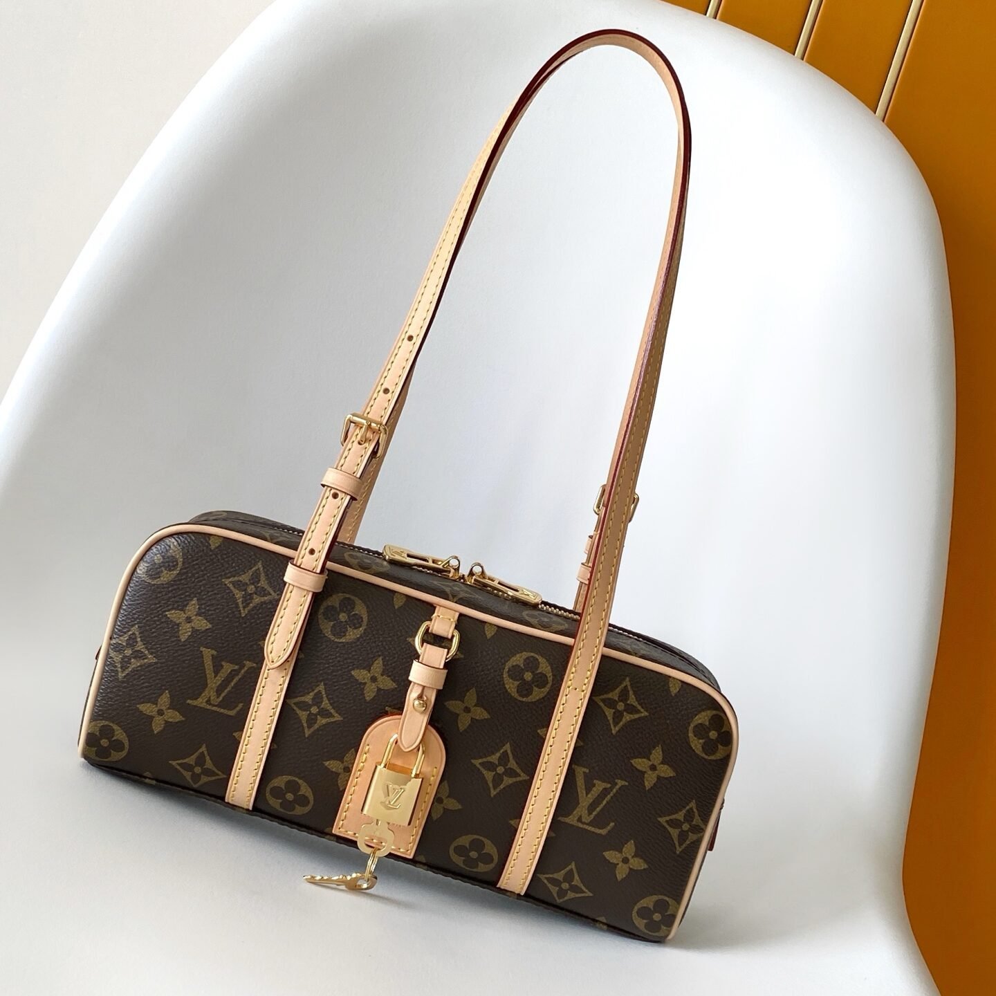Top-quality original M47031 revisits the classic design of the 1980s Cite handbag, creating a richly vintage style for this HangOn bag. The Monogram canvas and WN trim shape a modern bowling-bag silhouette, while the padlock and nameplate highlight the brand’s signature touch. The zipper closure and adjustable shoulder strap allow for flexible carrying. Dimensions: 26 × 11.5 × 6.5 cm