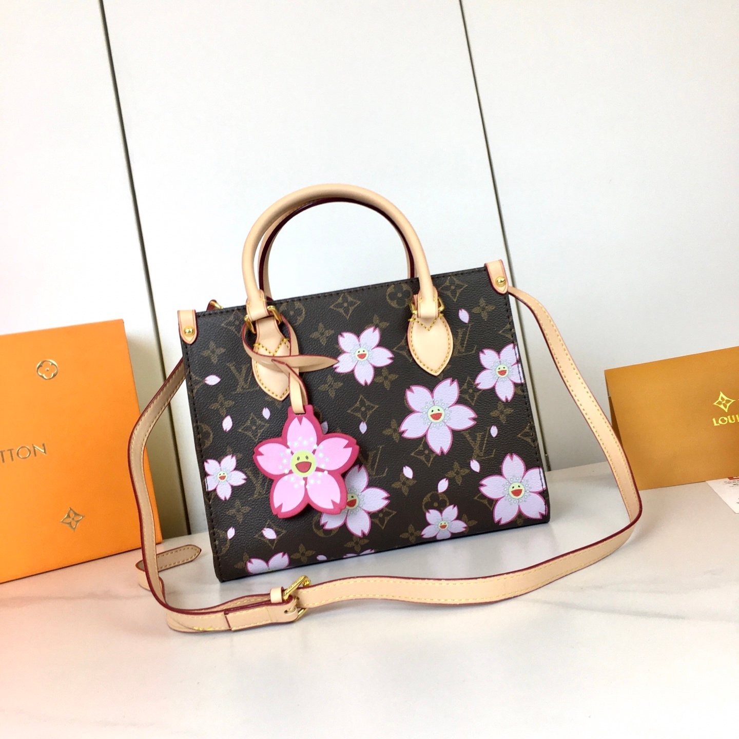 【OnTheGo Small Handbag】 m13269 Cherry Blossom/Takashi Murakami This OnTheGo small handbag is from the Louis Vuitton x Takashi Murakami reissue collection, featuring a vibrant Cherry Blossom pattern that refreshes the classic design. The Monogram coated canvas highlights the floral motif symbolizing new beginnings, while the cowhide leather trim and striking metal hardware exude sophisticated style. The detachable Cherry Blossom decoration adds a lively touch of creativity. Dimensions: 19 x 11.5 x 25 cm