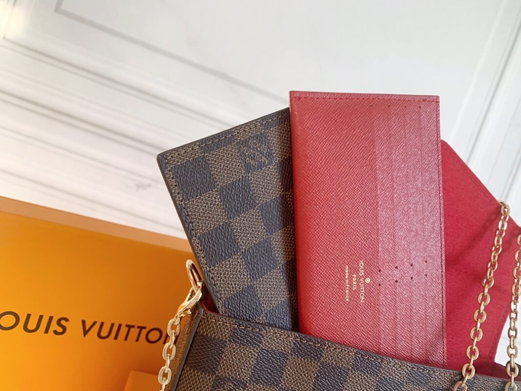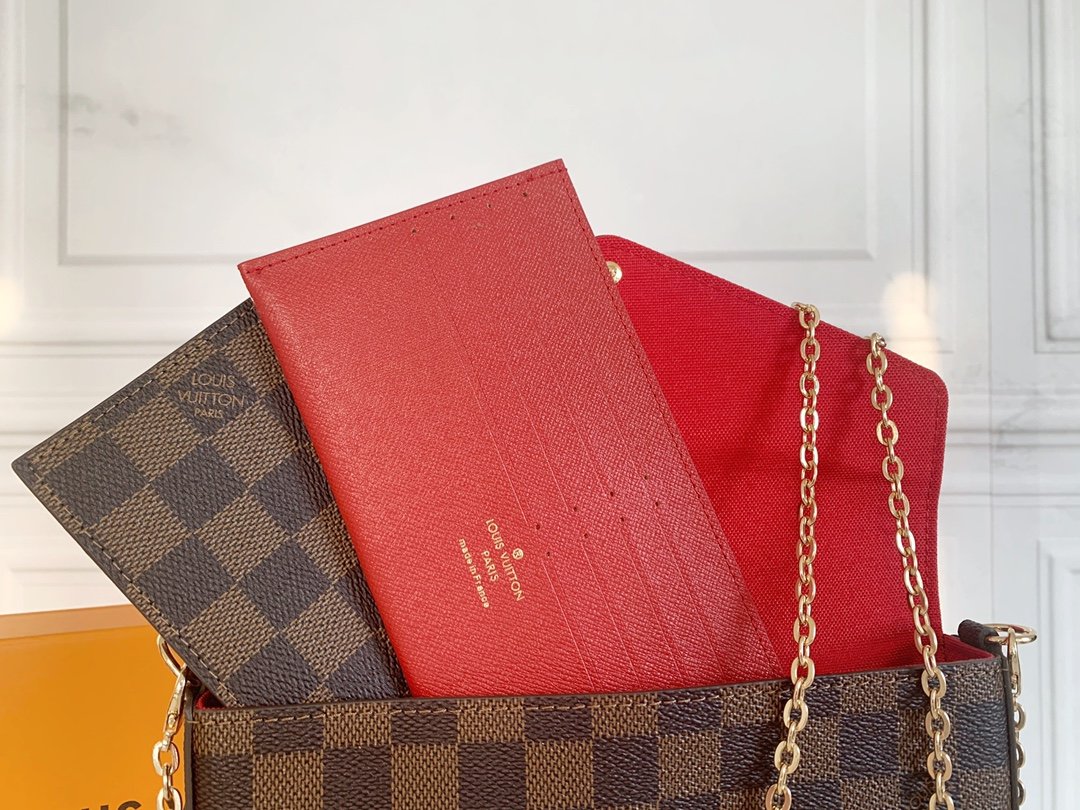 Three-piece set. Model M61276 Felicie handbag is elegant and luxurious. It contains two detachable pockets. It is a fashionable choice for carrying and organizing your everyday items. It is more than just a wallet. After removing the gold chain, it can also be used as a charming handbag or a small handbag. Size 21 * 11 * 2cm