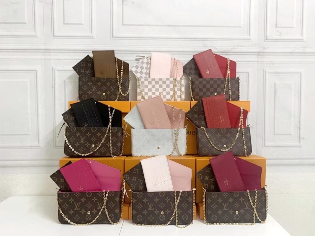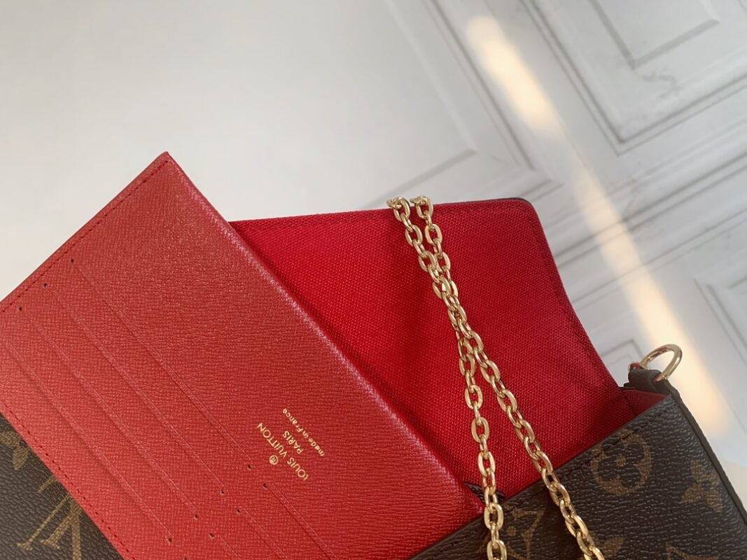 Three-piece set. Model M61276 Felicie handbag is elegant and luxurious. It contains two detachable pockets. It is a fashionable choice for carrying and organizing your everyday items. It is more than just a wallet. After removing the gold chain, it can also be used as a charming handbag or a small handbag. Size 21 * 11 * 2cm