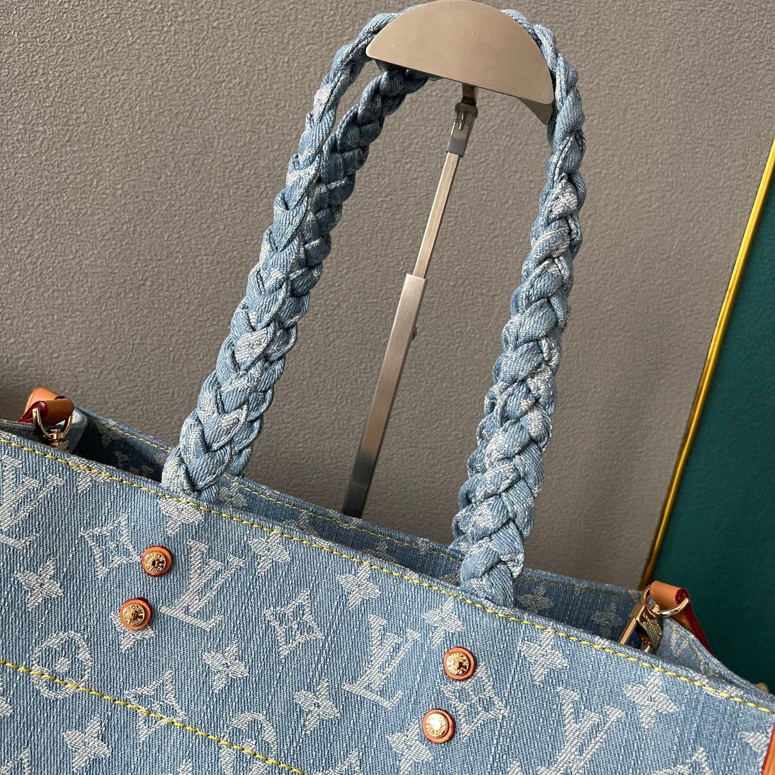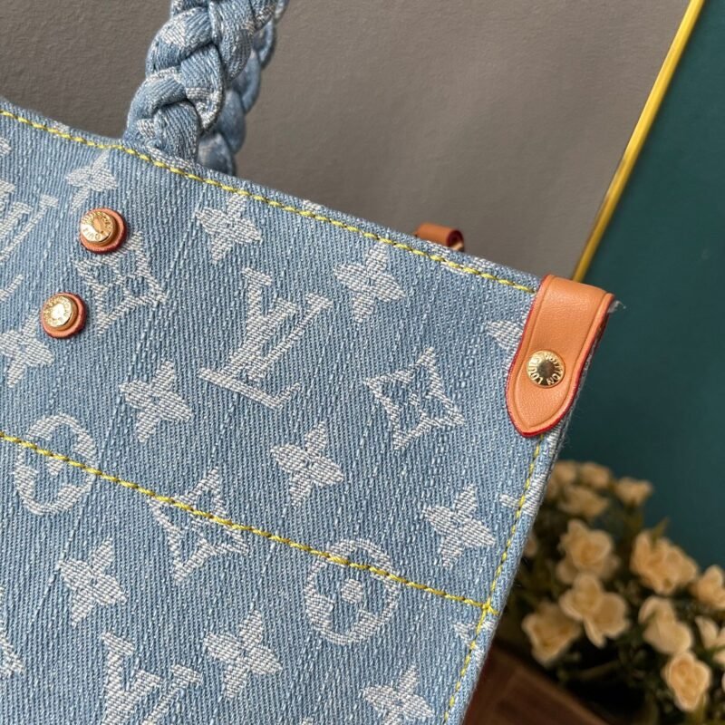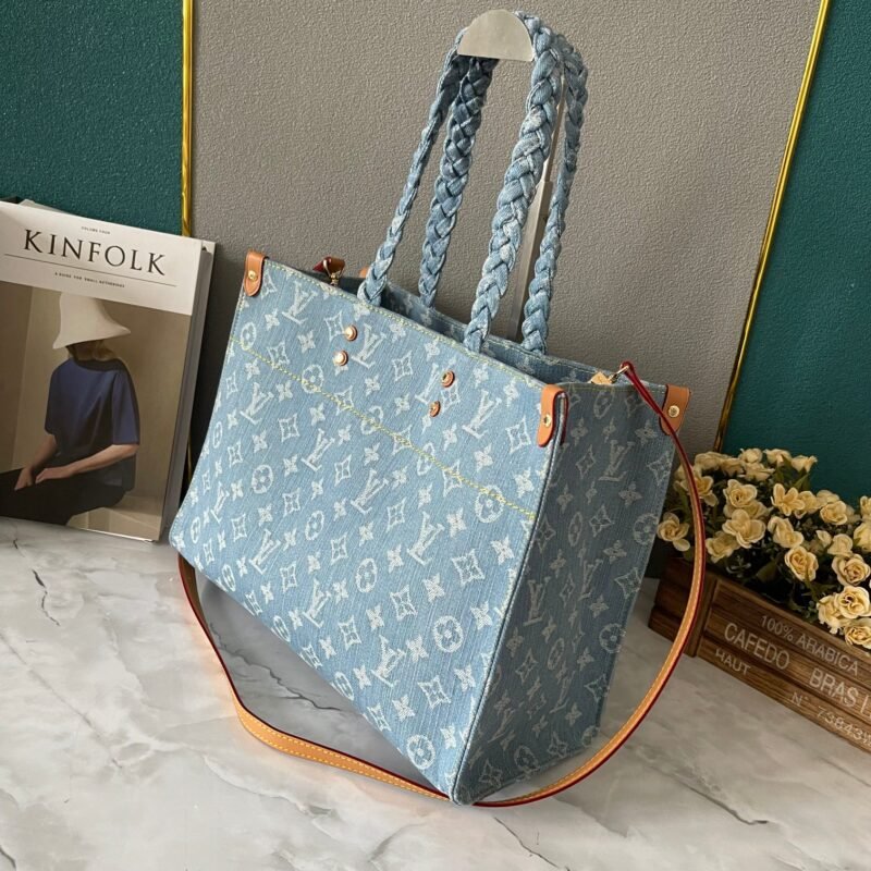 Blue Denim Checkerboard, Denim Quad Collection Onthego This Onthego handbag is refreshed with sand-washed Monogram jacquard tannins, with leather trimming and contrasting stitches. For business or leisure needs, the exquisite handle and long shoulder strap unlock a variety of carrying methods. Dimensions 35.0 x 27.0 x 14.0 cm