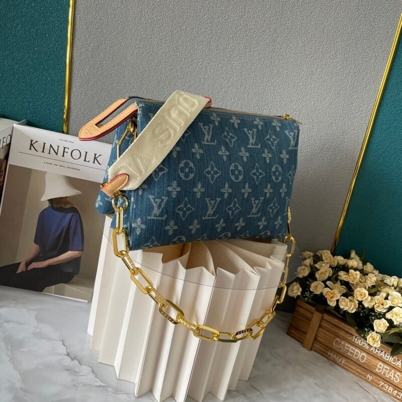 Upgraded version. M57790 M24564. This small Coussin handbag features a fresh and elegant vibe with the new season’s cotton denim. It achieves a unique look through bleaching and sand washing processes. Equipped with a detachable thick chain with engraved logo and a wide fabric shoulder strap, the lightweight carrying experience is once again upgraded. Size: 26 x 20 x 12cm.