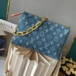 Upgraded version. M57790 M24564. This small Coussin handbag features a fresh and elegant vibe with the new season’s cotton denim. It achieves a unique look through bleaching and sand washing processes. Equipped with a detachable thick chain with engraved logo and a wide fabric shoulder strap, the lightweight carrying experience is once again upgraded. Size: 26 x 20 x 12cm.