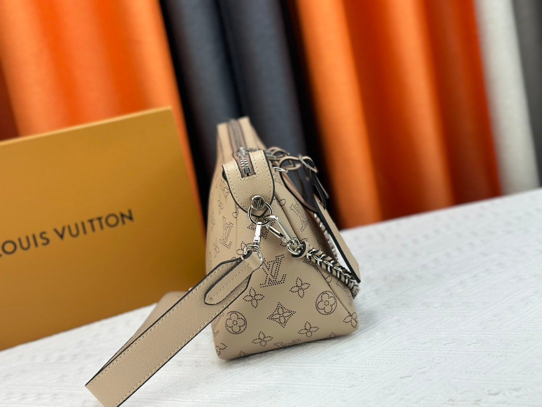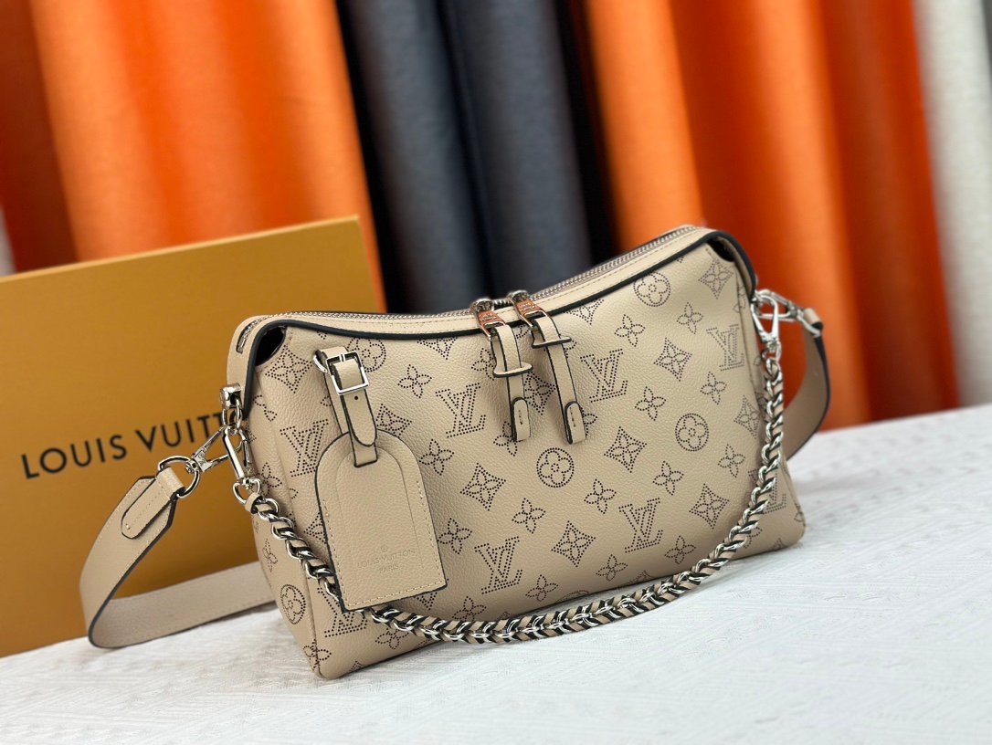 This Mahina Hand It All handbag is made of delicate perforated cowhide leather. Its elegant draping texture highlights the unique bag silhouette. The leather shoulder strap and the chain leather braided handle are both detachable, providing a trendy choice for daily outings. 29.0 x 18.0 x 13.0 cm (length x height x width). Perforated cowhide leather. Cowhide leather trim. Microfiber lining. Interior patch pocket. Metal studs. Shoulder strap.