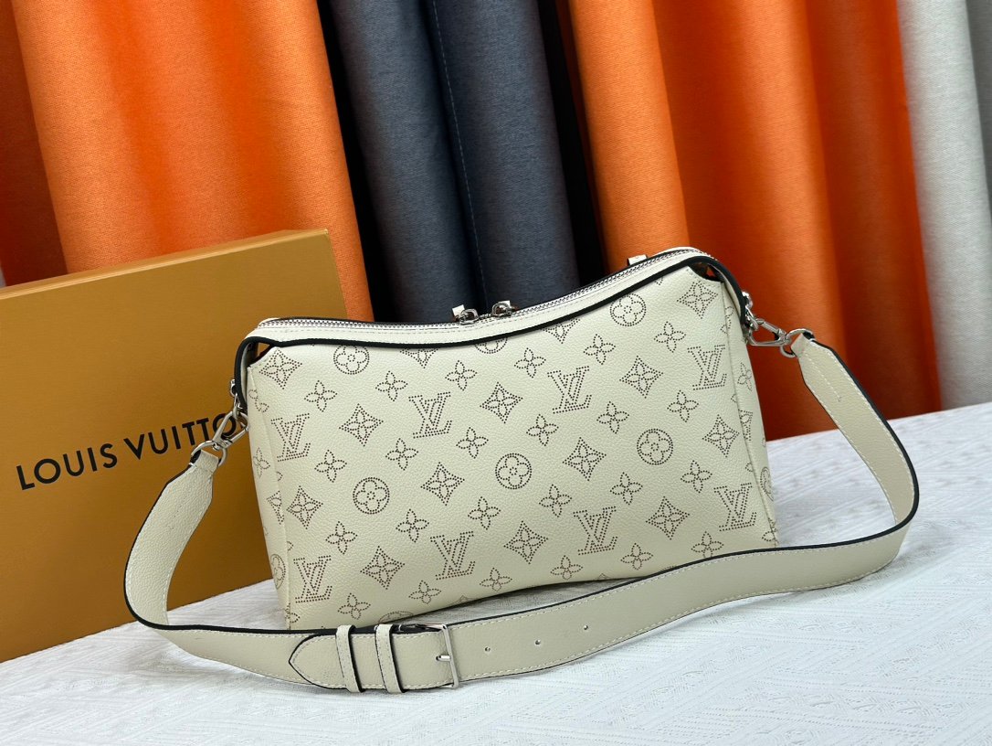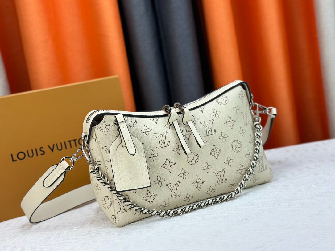 This Mahina Hand It All handbag is made of delicate perforated cowhide leather. Its elegant draping texture highlights the unique bag silhouette. The leather shoulder strap and the chain leather braided handle are both detachable, providing a trendy choice for daily outings. 29.0 x 18.0 x 13.0 cm (length x height x width). Perforated cowhide leather. Cowhide leather trim. Microfiber lining. Interior patch pocket. Metal studs. Shoulder strap.