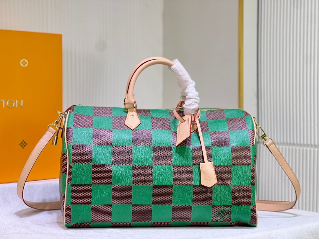 This Speedy P9 Bandoulière 40 Monogram Leather handbag is lined with soft-grained cow leather and sheepskin. It presents the blurry look of canvas printing with a silk screen Monogram pattern, expressing the new season of creative director Pharrell Williams. Size: 40x26x23cm