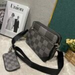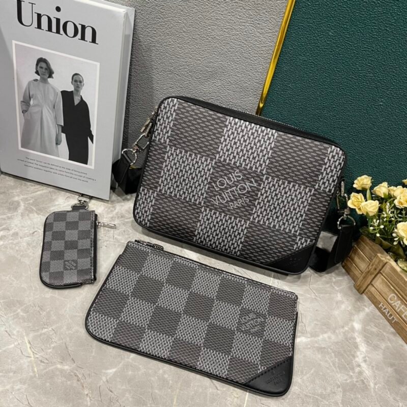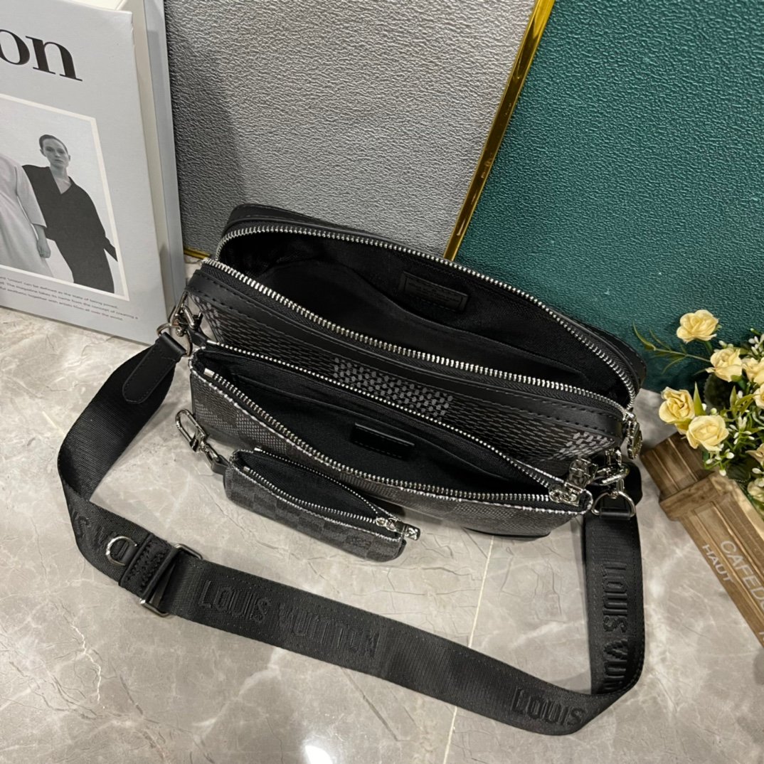 The upgraded versions M69443, M50017, M50027, M45320, and M69827. The new Trio messenger bag is made of Monogram Eclipse canvas and Monogram Eclipse Reverse canvas. The iconic monochromatic grey pattern highlights the lines of this multi-functional patchwork design. In addition to the functions of a traditional crossbody bag, it is also equipped with a detachable zipper bag and a coin purse attached to the strap. Dimensions: 25.0 x 18.5 x 7.0 cm.