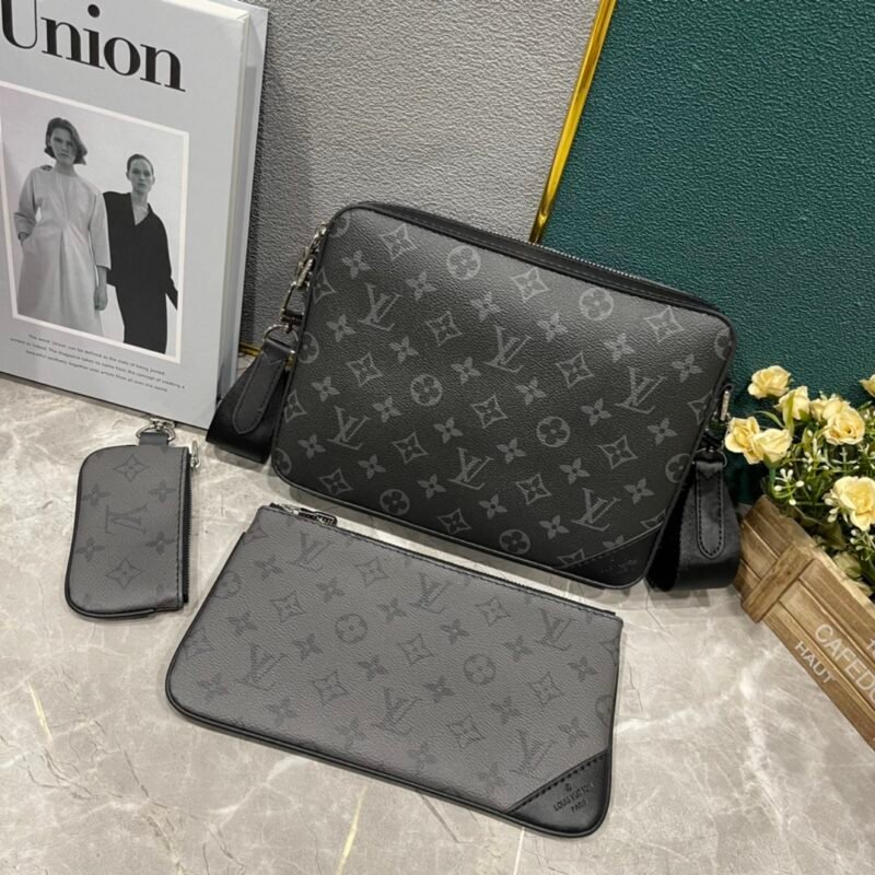 Upgraded M69443 M50017 M50027 M45320 M69827. The new Trio messenger bag is made of Monogram Eclipse canvas and Monogram Eclipse Reverse canvas. The iconic tonal grey pattern highlights the lines of this multifunctional patchwork design. In addition to the functions of a traditional crossbody bag, it is also equipped with a detachable zipper bag and a coin purse attached to the bag strap. Size: 25.0 x 18.5 x 7.0 cm.