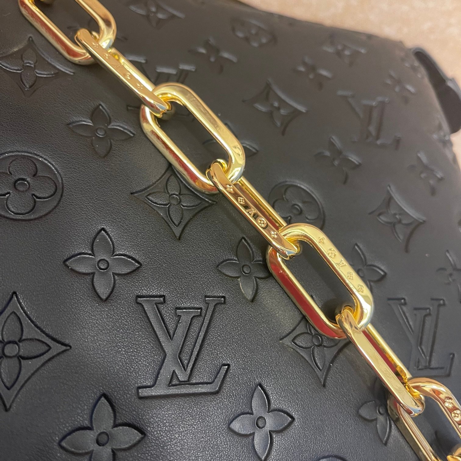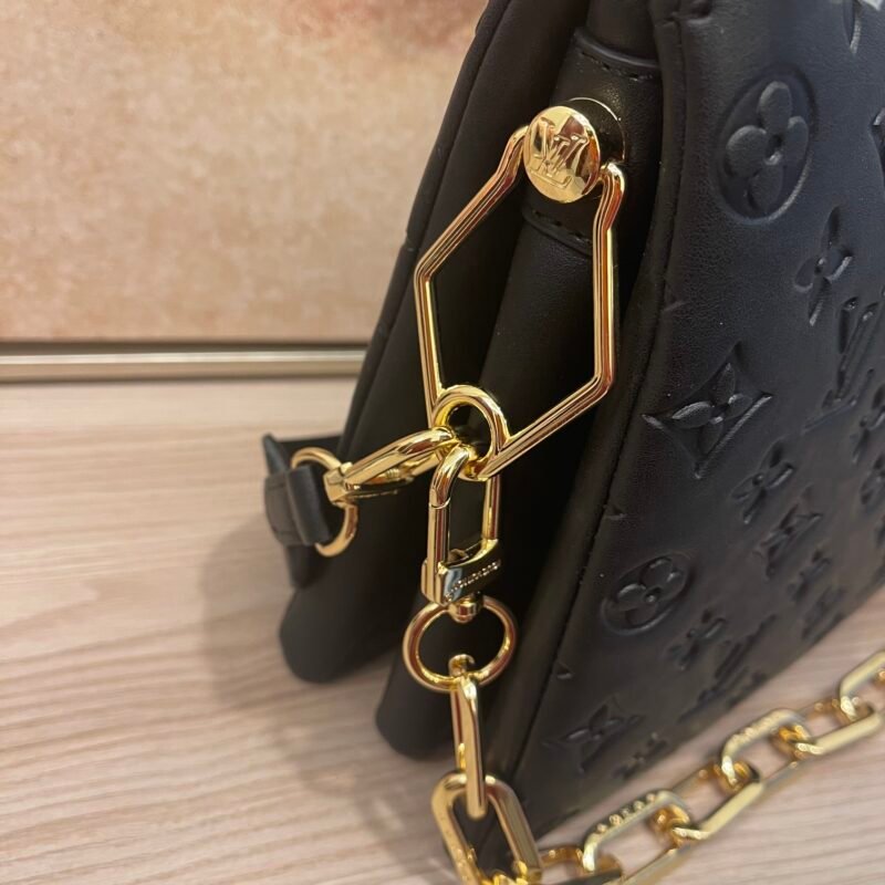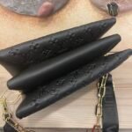 The top-of-the-line original M57793 57790 apricot Coussin small handbag shines at the Spring/Summer 2021 fashion show. Monogram embossed fluffy sheepskin creates a pillow configuration that injects avant-garde style into the minimalist design. Can be carried under the arm with a strap crossbody or an avatar chain baguette bag. Dimensions: 26 x 20 x 12 cm