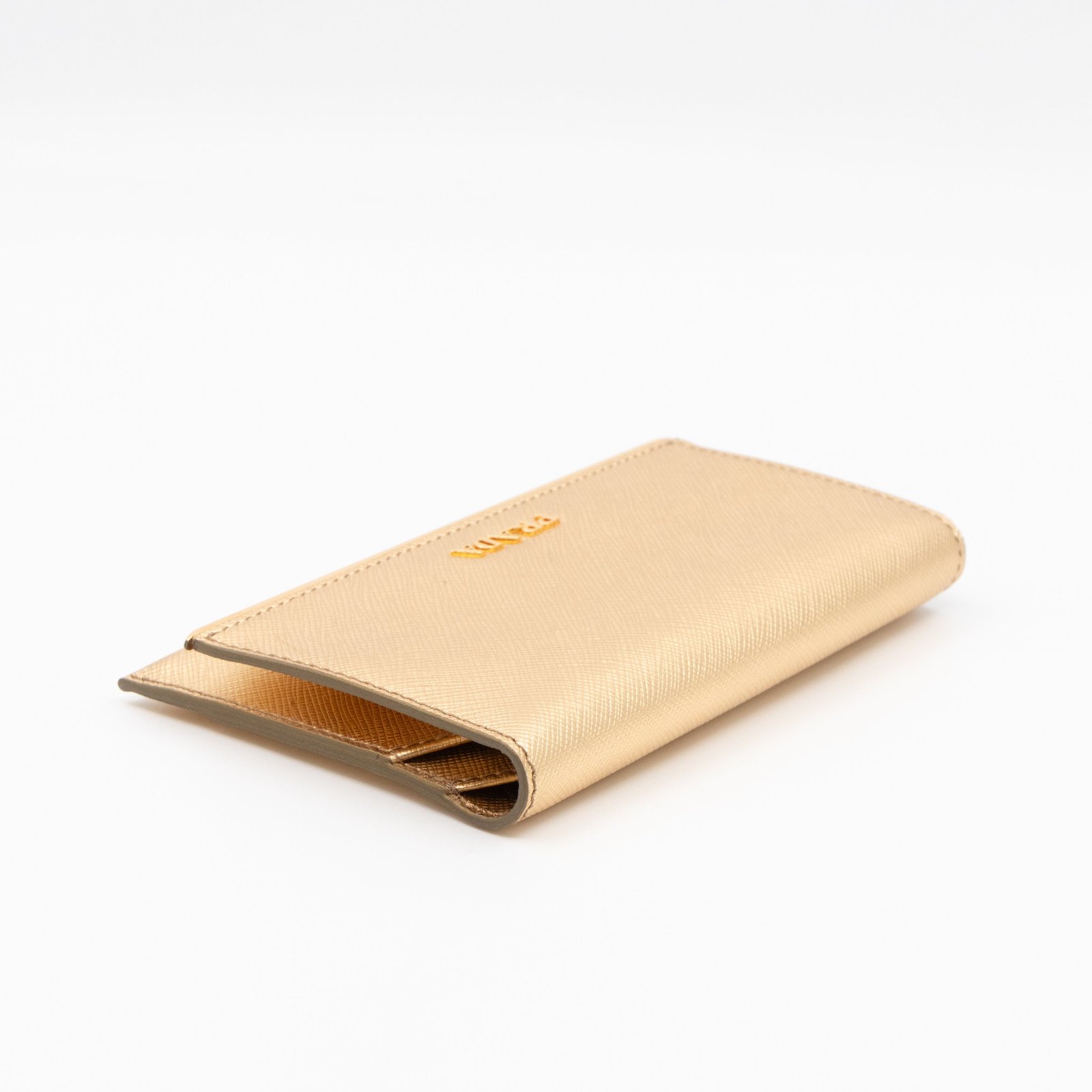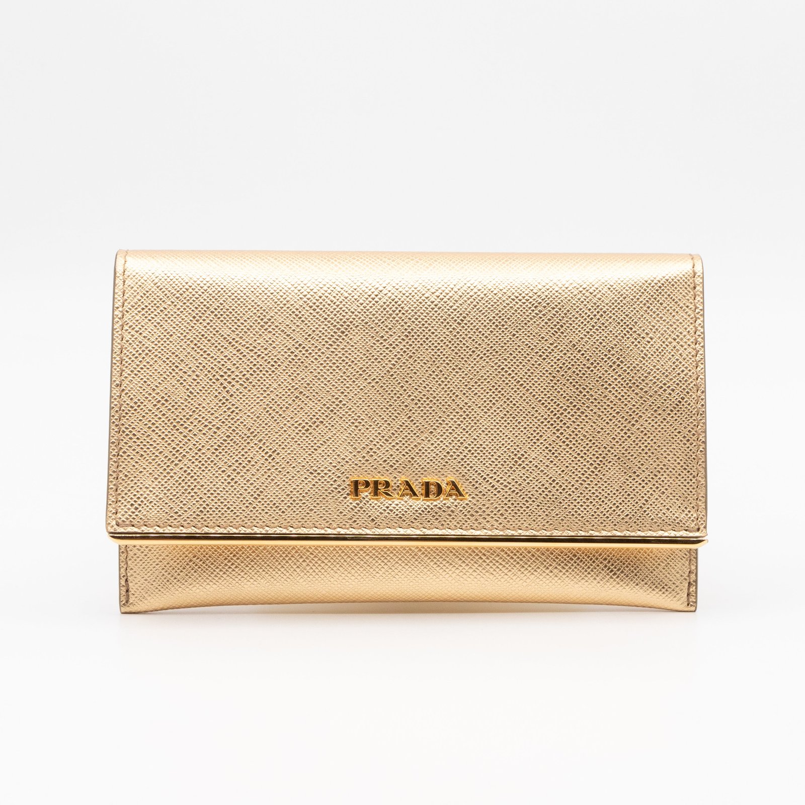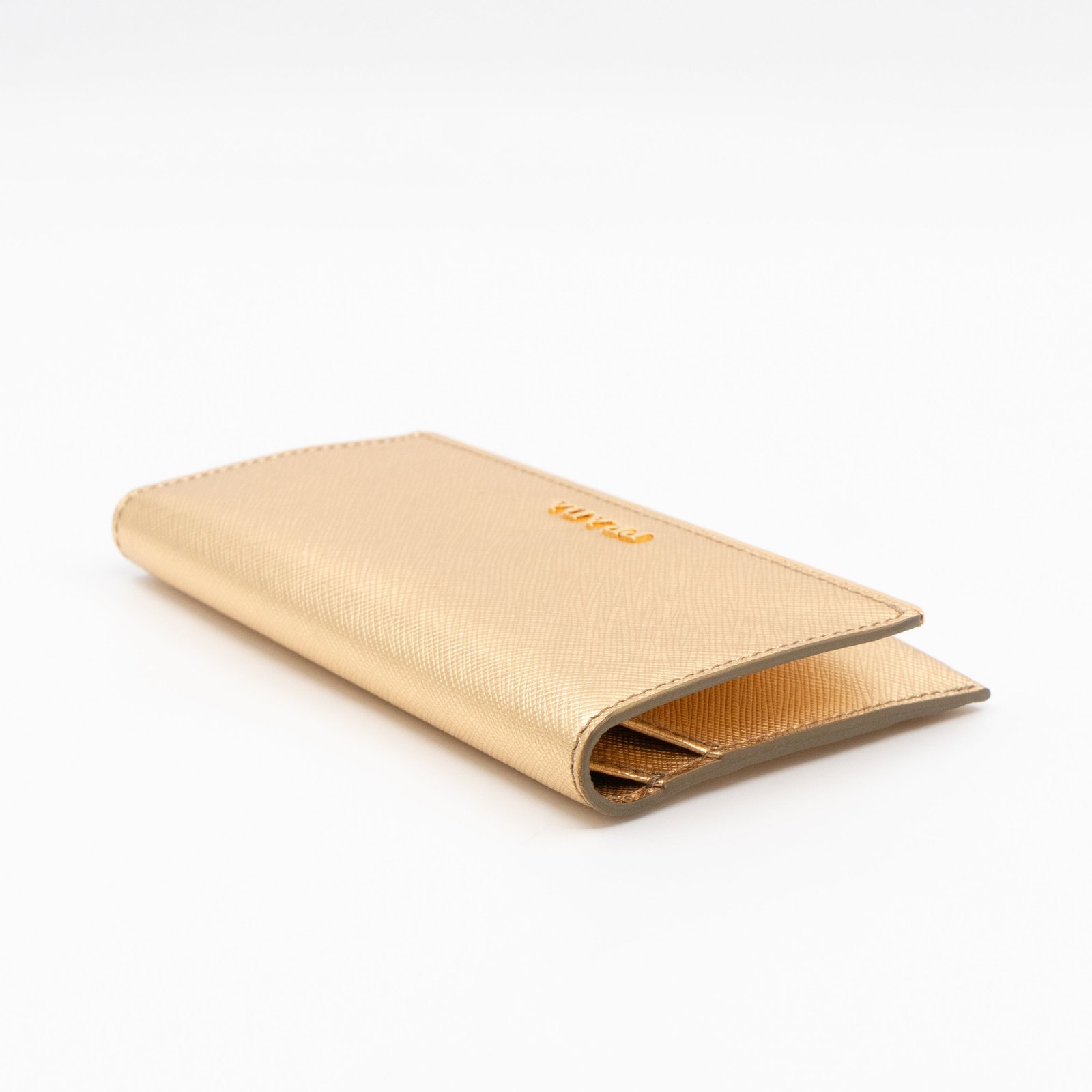A Metal Saffiano Wallet from Prada. This everyday accessory is made with gold mental color saffiano shine leather and gold-tone hardware. Opens to matching gold leather with an independent card holder and two patch pockets, perfect for organizing small items, providing both style and practicality.