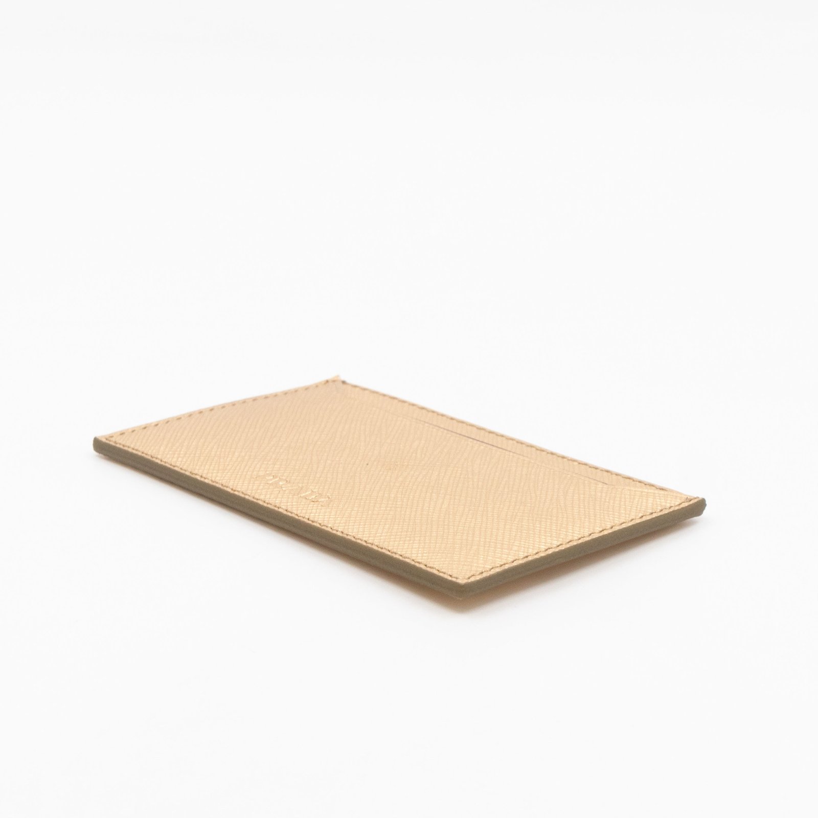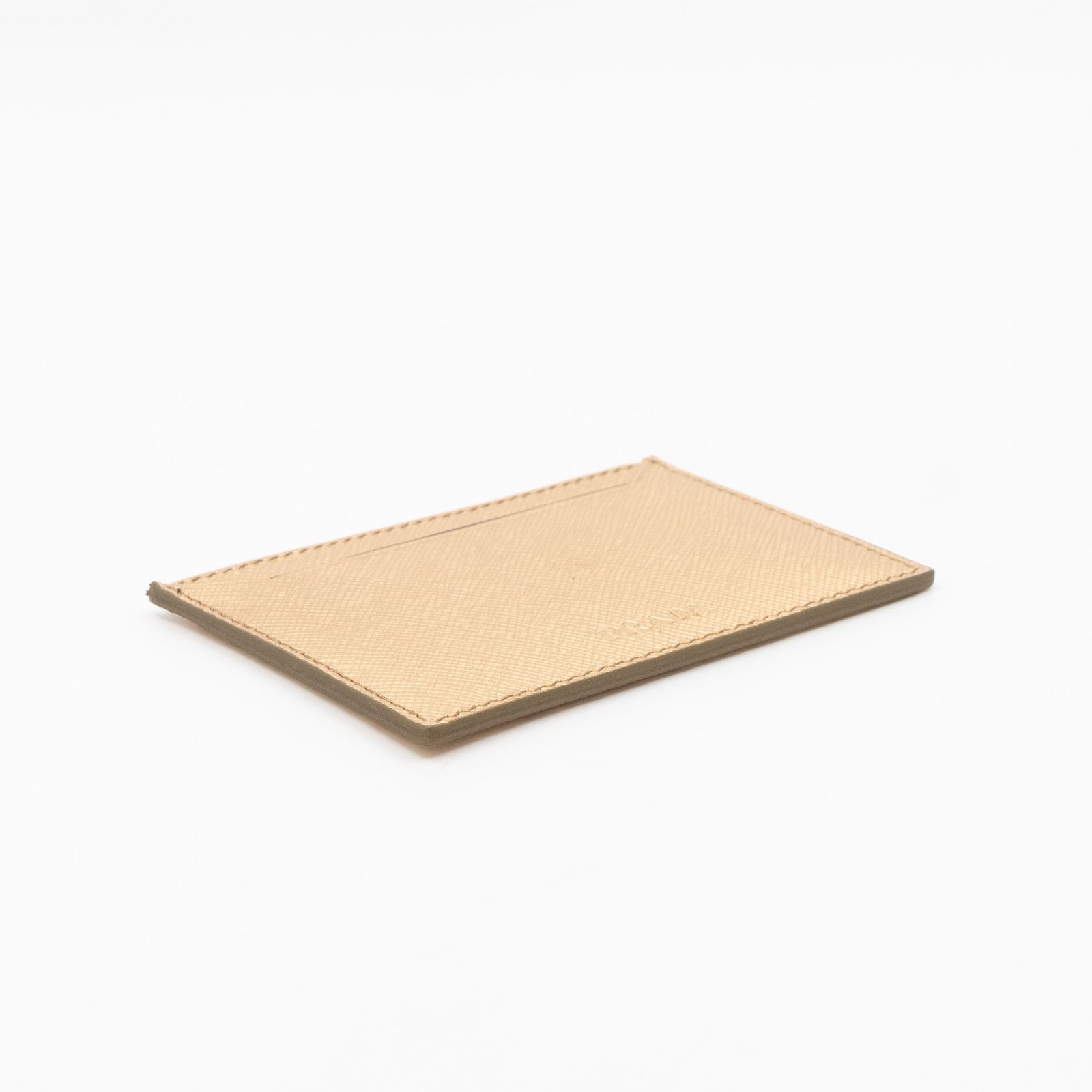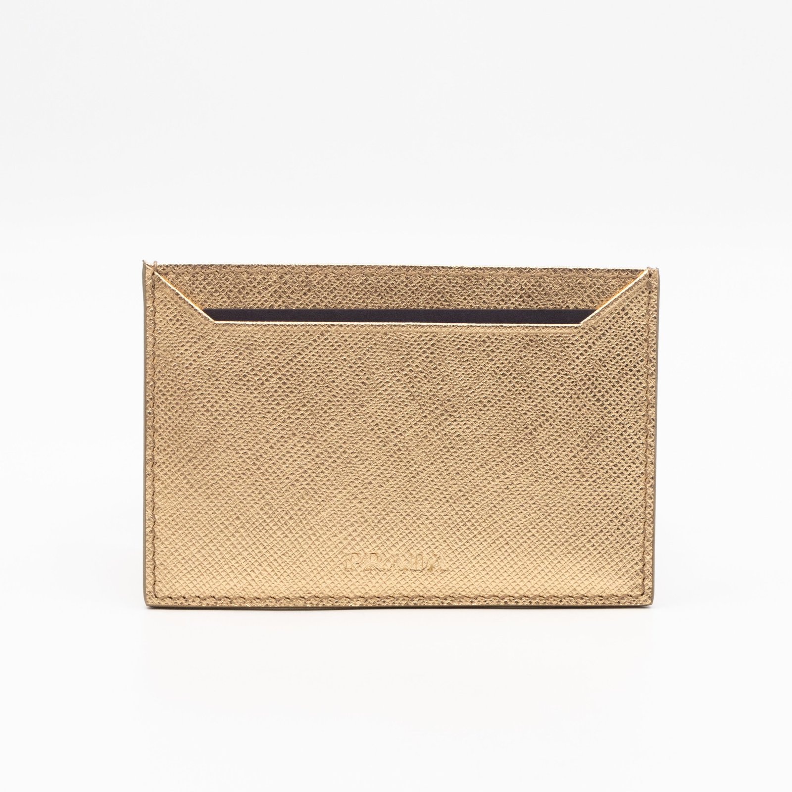 A Metal Saffiano Wallet from Prada. This everyday accessory is made with gold mental color saffiano shine leather and gold-tone hardware. Opens to matching gold leather with an independent card holder and two patch pockets, perfect for organizing small items, providing both style and practicality.