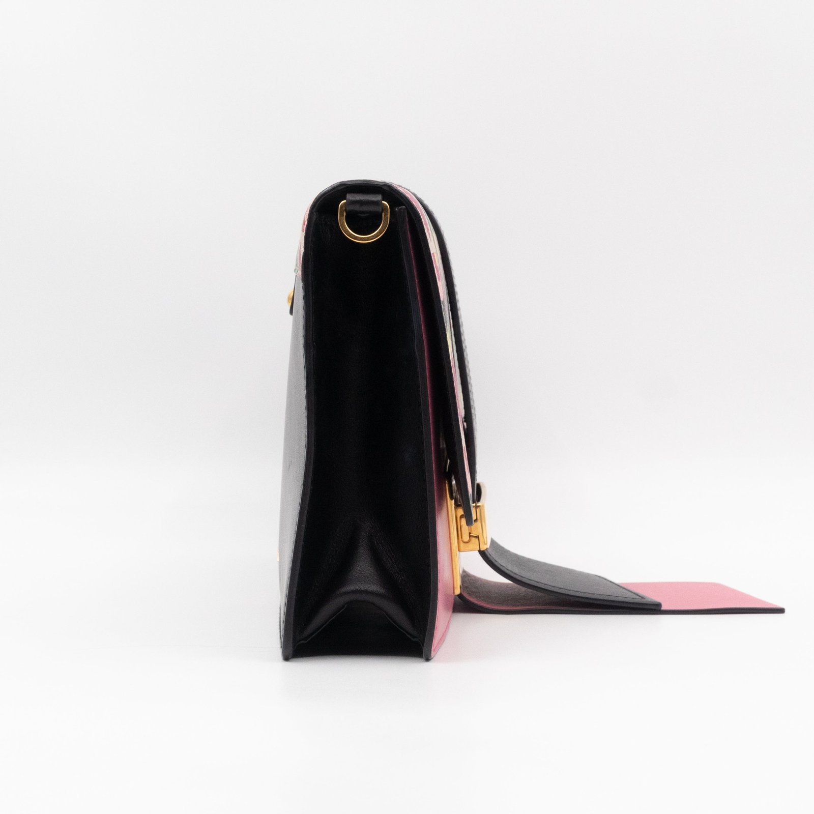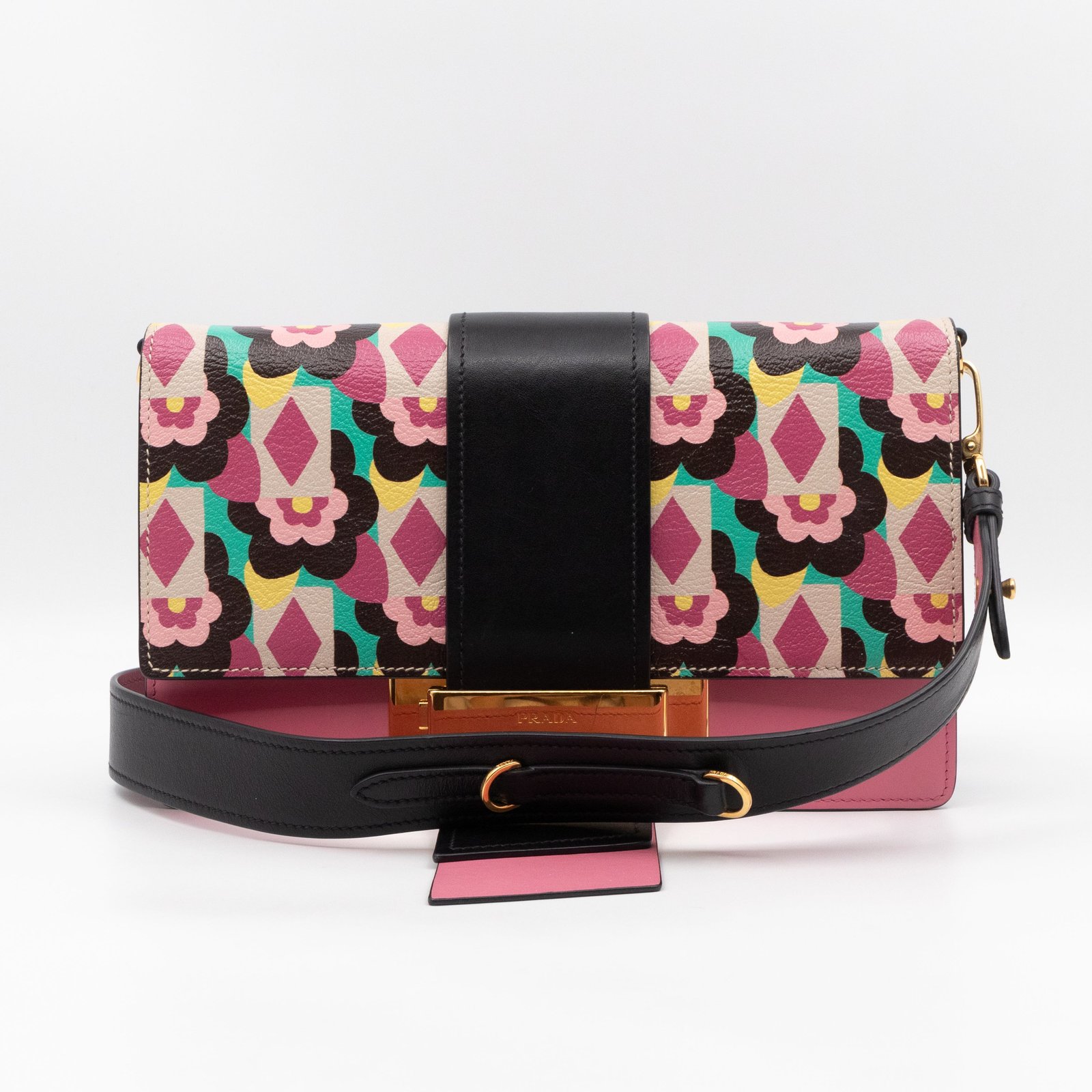 This is a Prada Multicolor Floral Print Leather Plex Ribbon Shoulder Bag from Spring/Summer 2017 Bag Collection. Crafted from peony floral print leather and gold-tone hardware for a chic finish. Opens to a black canvas interior. Carry your every day essentials in style. Pink & black reversible long strap makes this easy to use as a daily crossbody bag. The retail price is €1950.