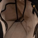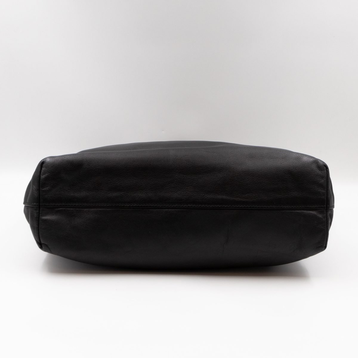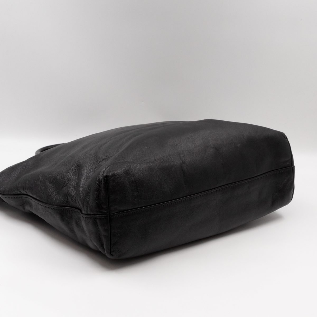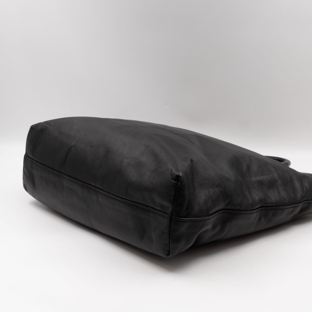 A large and charming shopping tote from Prada. Made with black leather with gold-tone hardware. Dual handles and an adjustable shoulder strap. Spacious insides with slim pocket on one side and a large zipper pocket on the other side. Button closure in the middle to keep your items safe.